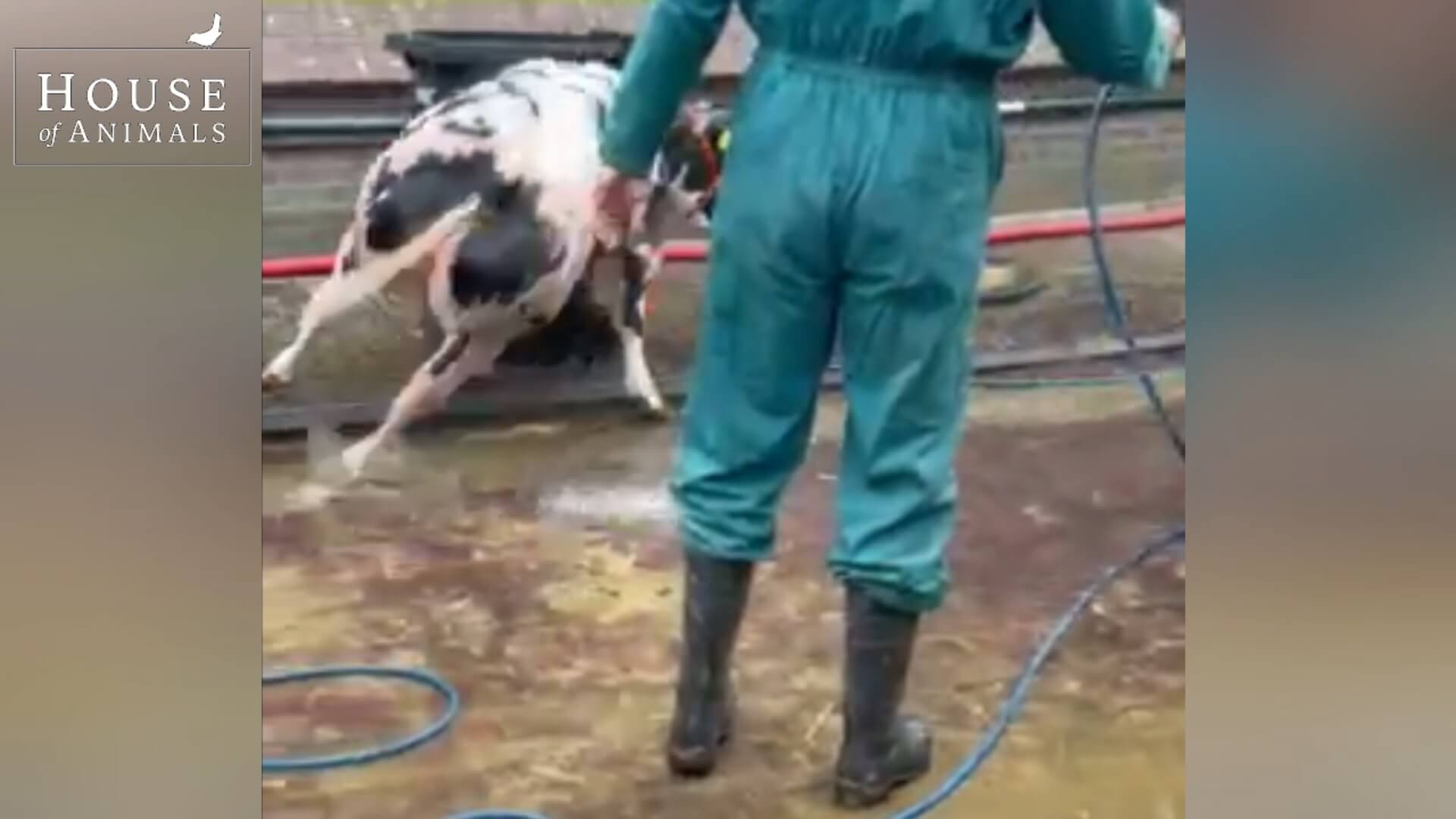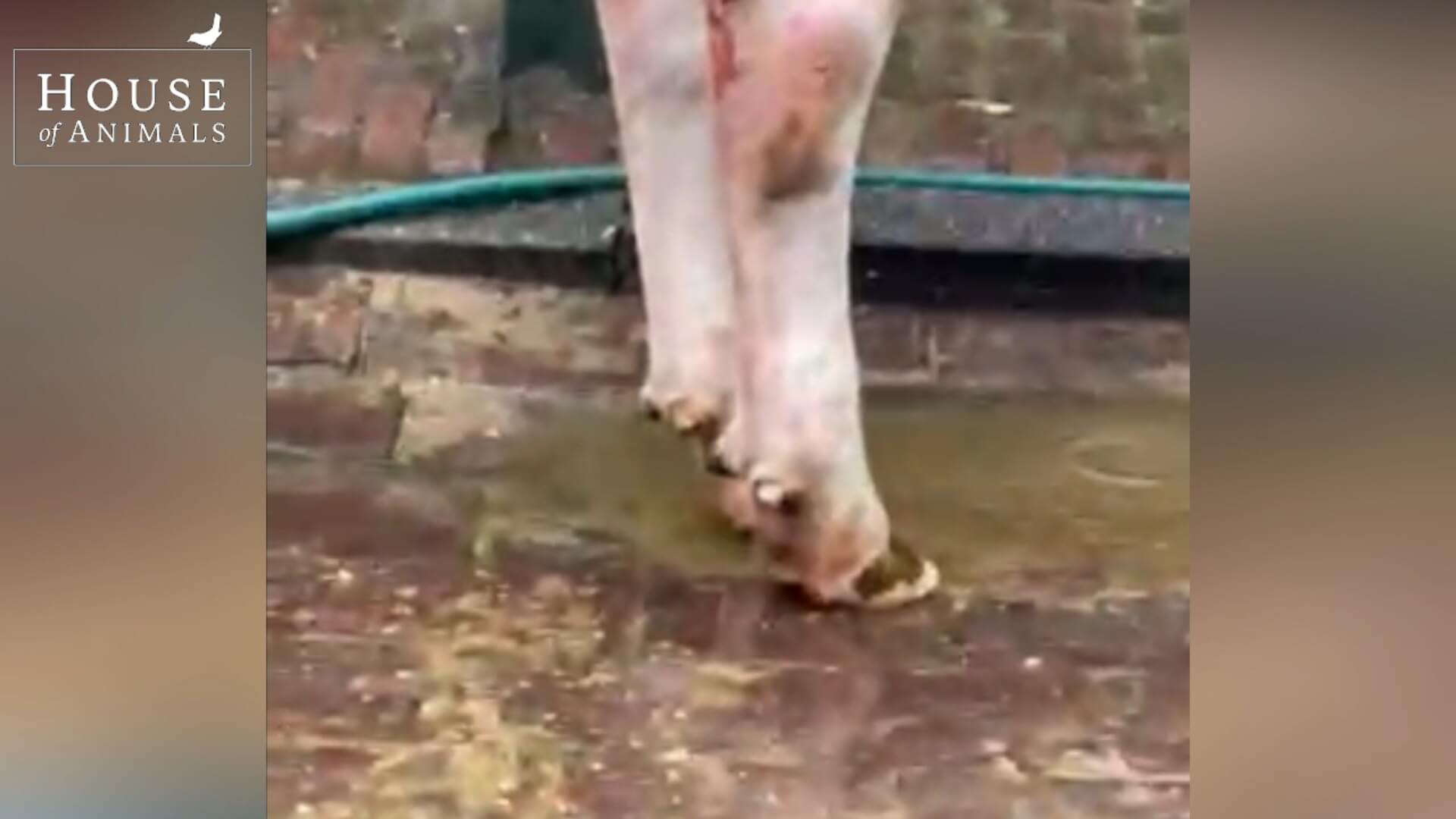 Op onderstaande beelden gemaakt door Eyes on Animals is het schoonspuiten te zien, waarbij een van de dieren lelijk ten val raakt en een verwonding oploopt: