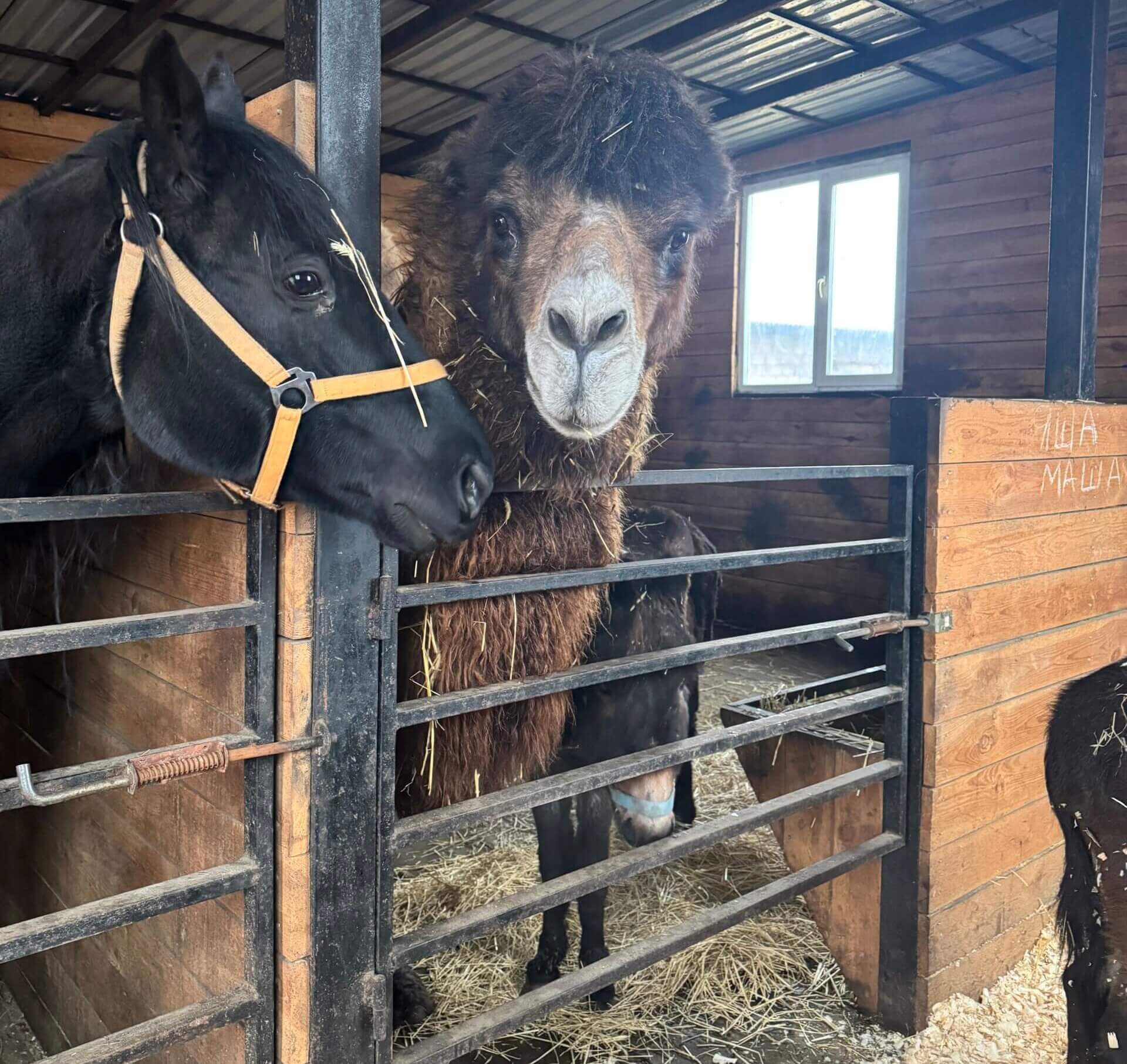 Het harige stel heeft, zoals elk jaar, een wollige wintervacht. En ook op een andere manier trotseren ze samen de kou: Masha kruipt graag onder Yasha’s buik. Het is haar veilige haven, ook als er zware explosies zijn schuilt ze onder de buik van haar favoriete kameel. De bombardementen gaan ondanks de strenge winter onverminderd door en de frontlinie komt steeds dichterbij Pegasus.