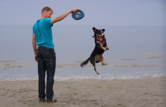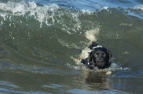De Vakantiefoto van de dag is Chess! “Waar we Chess ( stabij van 3 jaar ) een groot plezier mee doen is zwemmen. Dit jaar op vakantie in Denemarken. Het maakt dan niet uit hoe hoog de golven zijn. Als hij maar een stok kan ophalen.”…