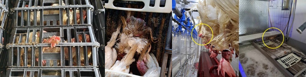 “Onverdoofde kippen vertoonden reacties wanneer hun slagaders aangesneden werden of flapperden met hun vleugels terwijl ze boven de bloedgoot hingen. De NVWA zag ook kippen die de kop optrokken om de aansnijmessen te ontwijken. Niet aangesneden kippen belanden bij bewustzijn in een heet broeibad. Tijdens een controle in maart 2023 zag een inspecteur maar liefst 12 kippen die reacties vertoonden bij het aansnijden. Iets verderop hingen 8 kippen die hun vleugels tegen het lichaam geklemd hielden, wat ook duidt op bewustzijn. Bij verdoofde en dode kippen hangt het lichaam slap, de vleugels hangen af.”