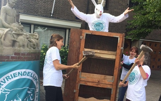 Het landelijke Kinderboerderijenbesluit werd gisteren gelanceerd in Amsterdam. Wij ondersteunen dit initiatief. Als symbool voor de vaak slechte huisvesting en de respectloze houding naar dieren sloeg actrice Karin van Holst Pellekaan tijdens de aftrap een konijnenflat aan flarden. Op de FOTO: Karen van Holst Pellekaan (actrice, kinderboekenschrijfster…