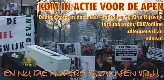 Dierenvrienden protesteren voor poort apenlaboratorium Op vrijdagmiddag 4 oktober aanstaande is het Werelddierendag, dierenrechtenorganisatie EDEV – Een DIER Een VRIEND – zal dan vanaf 15.00 uur pal voor de poort van het BPRC in Rijswijk protesteren. Het BPRC is het grootste apenlaboratorium in Europa, heeft rond…