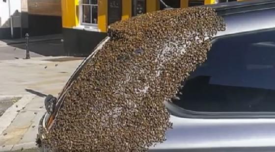 Bijenzwerm achtervolgt koningin in auto