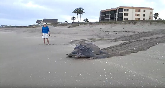 Spectaculaire beelden van een reusachtige lederschildpad zijn opgedoken op internet. Op de beelden is te zien hoe de immens grote schildpad, mogelijk een van de grootste ter wereld, over het strand loopt, terug het water in. De video is op een onbekende locatie opgenomen. Te…
