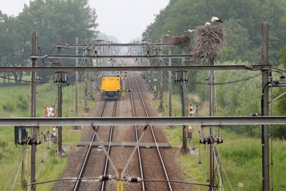 Ooievaars bouwen nest op bovenleiding van treinspoor in Hoogeveen