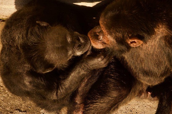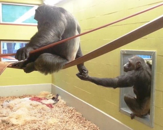 Chimpansee Linda sluit voor het eerst een soortgenoot in haar armen