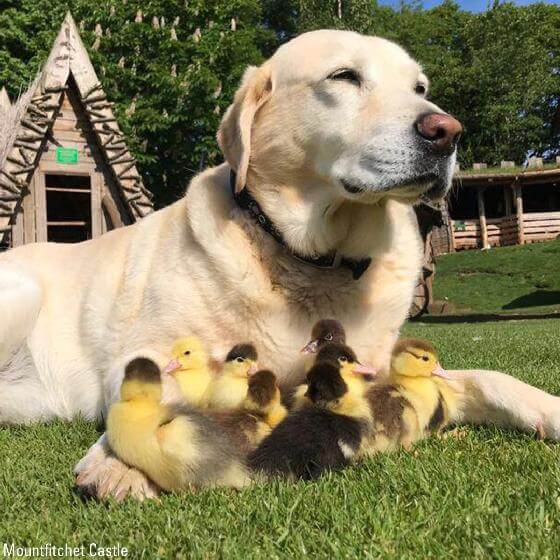 De tienjarige labrador Fred van kasteel Mountfitchet in Engeland, heeft onlangs negen verweesde eendenkuikens geadopteerd. Ze volgen hem overal, en slapen zelfs in zijn mand. Toen medewerkers van kasteel Mountfitchet op het terrein negen eendenkuikens zagen ronddolen zonder hun moeder, namen ze de diertjes mee…