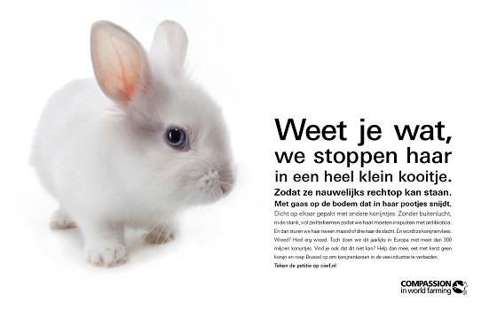 Sinds gisteren is op NS-stations in heel Nederland de aangrijpende konijnenposter van Compassion in World Farming Nederland (CIWF) te zien. De internationale dierenbeschermingsorganisatie vraagt hiermee aandacht voor het verborgen dierenleed in de vleeskonijnenindustrie. CIWF lanceerde begin oktober een crowdfunding-actie voor de posters, waarop overweldigend werd gereageerd. De…