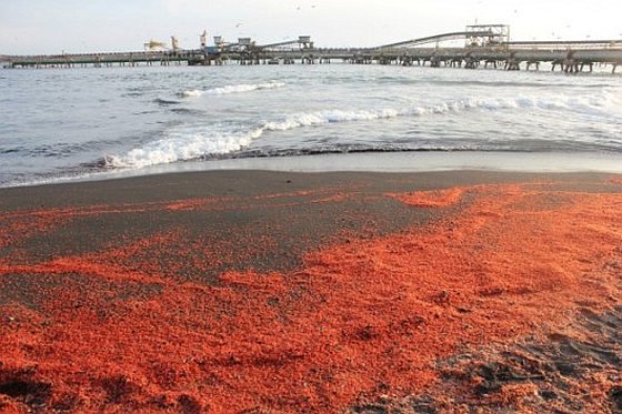Het moet een luguber gezicht zijn geweest, een strand als door een rood kleed bedekt met dierenlijkjes. Op zo’n 500 kilometer van Chili’s hoofdstad Santiago, in Coronel, zijn afgelopen week duizenden dode, rode garnalen op het strand aangespoeld. Lokale vissers wijten het probleem aan de…