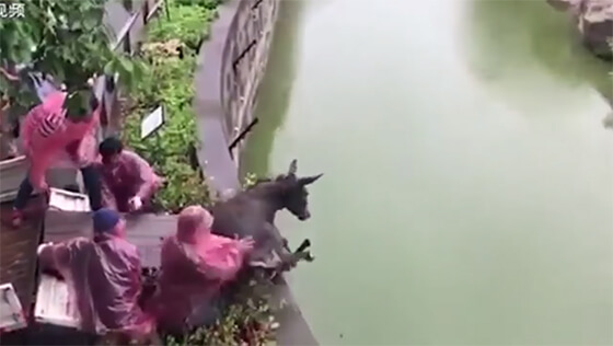 Medewerkers van de Chinese dierentuin Changzhou Zoo hebben een levende ezel aan drie tijgers gevoerd. Het schokkende tafereel werd vastgelegd op video. Op de beelden is te zien hoe de angstige ezel in de gracht rond het tijgerverblijf wordt geduwd. Het dier maakt geen kans:…