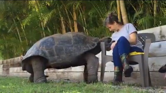 De reuzenschildpad spreekt tot de verbeelding. Reuzenschildpadden leven op land, kunnen heel oud worden en bestaan al heel lang, ze zijn enorm van formaat, worden bedreigd en zijn, net als de hond of de kat, dol op een knuffel. Wij kunnen aan het filmpje niet…