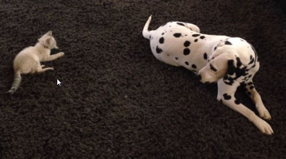 Terwijl Lady de dalmatiër rustig op het tapijt ligt, besluit de jonge kat Squirt in onderstaande video dat een hondenstaart toch wel erg interessant speelgoed is. Het kitten is duidelijk onder de indruk van de staart en dit levert leuke speelse beelden op tussen kat…