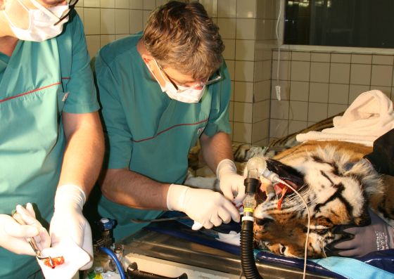 Siberische tijger Taiga krijgt tandartsbehandeling