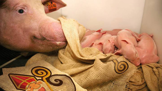 Een simpele jute doek als Sinterklaascadeau? Een mens zou je daar niet blij mee maken, maar een varken wel! Zwangere zeugen in de vee-industrie kunnen er namelijk provisorische nestjes mee maken, waardoor haar biggetjes niet op beton of hard plastic hoeven te liggen. Om deze…
