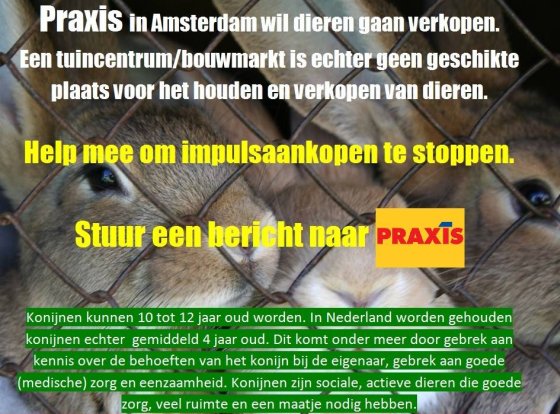 Bouwmarktketen Praxis heeft plannen om dieren te gaan verkopen in een aantal tuincentrumfilialen, in elk geval op locatie Westpoort in Amsterdam. Dat laat de Partij voor de Dieren Amsterdam op haar Facebookpagina weten. Veel konijnen en knaagdieren in Nederland zijn slachtoffer van impulsaankopen. Ze leven…