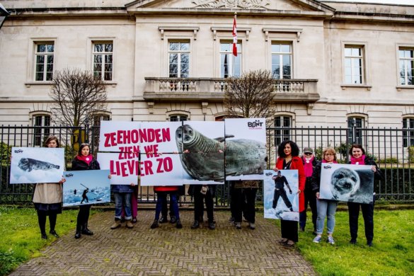 Dierenbeschermingsorganisatie Bont voor Dieren stond op 3 april met een groep medestanders voor de Canadese ambassade in Den Haag om aandacht te vragen voor de verschrikkelijke Canadese zeehondenjacht die ieder moment weer van start kan gaan. Tijdens de ludieke actie hielden de deelnemers metersgrote dubbelbedrukte…